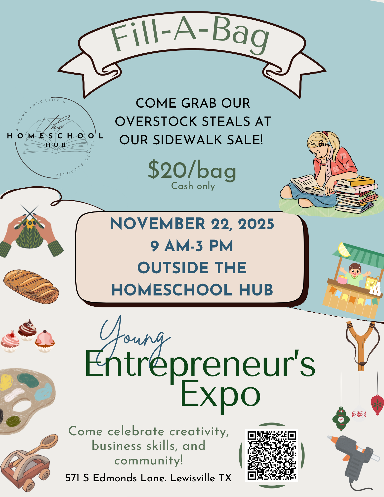 A: We will be marketing to all families in the DFW area, especially our homeschool communities and premier partners. Your audience will be looking to buy for their Christmas list and desire to support young entrepreneurs. We have combined events with our Fill-a-Bag Curriculum sale happening at the same time, to provide the greatest potential of shoppers and supporters