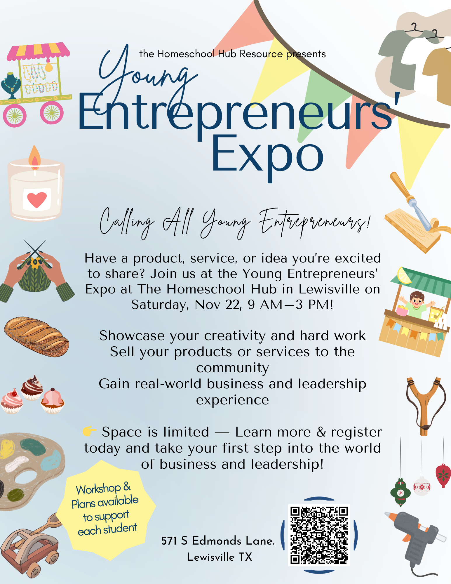Open to all students in grades 3–12 (homeschool, public, or private). Parents may assist, but students must be the main producers and presenters of their products or services.